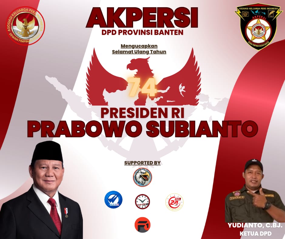 Banten — Dalam suasana penuh penghormatan dan kebanggaan, Asosiasi Keluarga Pers Indonesia (AKPERSI) Dewan Pimpinan Daerah (DPD) Provinsi Banten menyampaikan ucapan selamat ulang tahun kepada Presiden Republik Indonesia, Prabowo Subianto, yang ke-74 tahun.