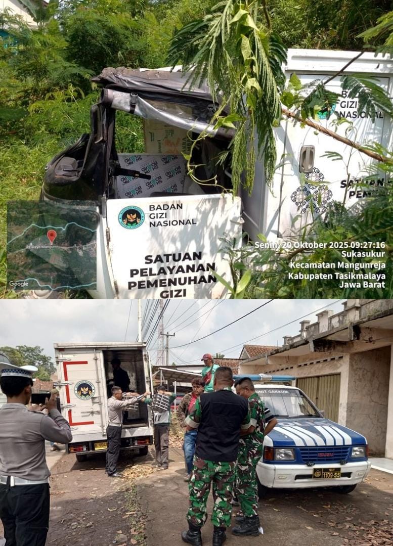 Tasikmalaya,fokusfakta.com— Kecelakaan tunggal menimpa sebuah kendaraan roda tiga jenis Viar box bermuatan Makanan Bergizi Gratis (MBG) di Jl. Raya Mangunreja, Desa Sukasukur, Kecamatan Mangunreja, Kabupaten Tasikmalaya, Jawa Barat, Senin (20/10/2025) pagi.